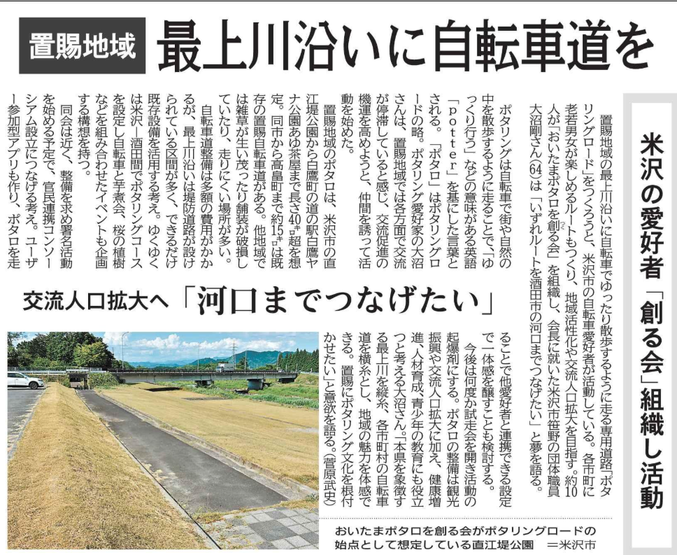 今後は何度か試走会を開き活動の起爆剤にする。ポタロの整備は観光振興や交流人口拡大に加え、健康増進、人材育成、青少年の教育にも役立つと考える大沼さん。「本県を象徴する最上川を縦糸、各市町村の自転車道を横糸とし、地域の魅力を体感できる。置賜にポタリング文化を根付かせたい」と意欲を語る。