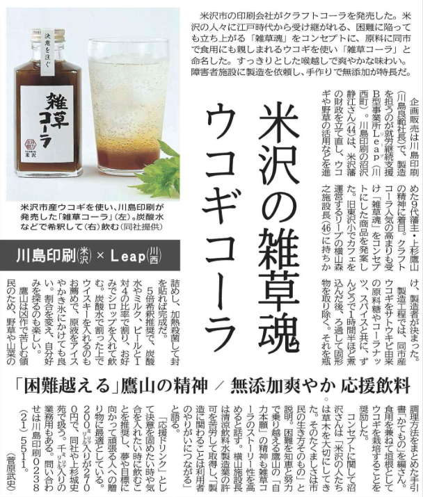米沢市の印刷会社がクラフトコーラを発売した。米沢の人々江戸時代受け継がれる、困難に陥っても立ち上げる「雑草魂」をコンセプトに、原料に同市で食用にも親しまれるウコギを使い「雑草コーラ」と命名した。すっきりとした喉越しで爽やかな味わい。障害者施設に製造を依頼し、手作りで無添加が特長だ。