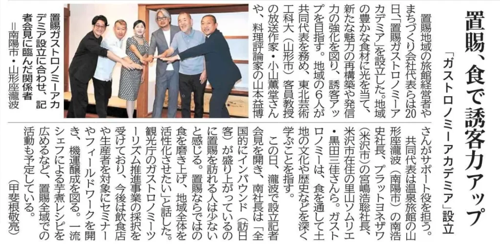 この日、瀧波で設立記者会見を開き、南社長は「全国的にインバウンド(訪日客)で盛り上がっているのに置賜を訪れる人は少ないと感じる。置賜ならではの食を磨き上げ、地域全体を活性化させたい」と話した。観光庁のガストロノミーツーリズム推進事業の採択を受けており、今後は飲食店や生産者を対象にセミナーやフィールドワークを開き、機運醸成を図る。一流シェフによる芋煮レシピを広めるなど、置賜全域での活動も予定している。