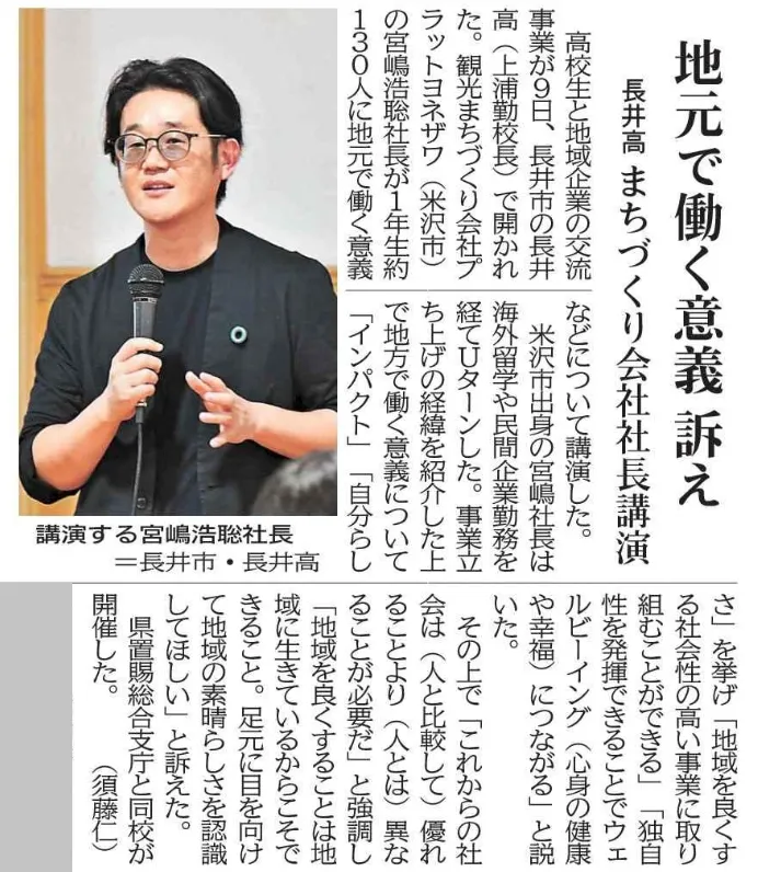 講演する宮島浩聡社長(H15卒)=長井市・長井高 高校生と地域企業の交流事業が9日、長井市の長井高(上浦勤校長)で開かれた。観光まちづくり会社プラットヨネザワ(米沢市)の宮嶋浩聡社長(H15卒)が1年生約130人に地元で働く意義などについてなどに講演した。