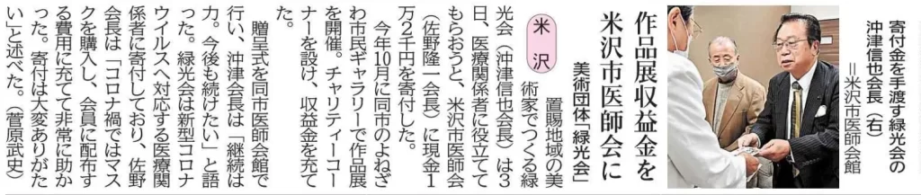 寄付金を渡す緑光会の沖津信也会長(S41卒)=米沢市医師会館 置賜地域の美術家でつくる緑光会(沖津信也会長・S41卒)は3日、医療関係者に役立ててもらおうと、米沢市医師会(佐野隆一会長)に現金1万2千円を寄付した。