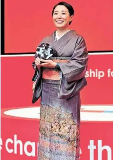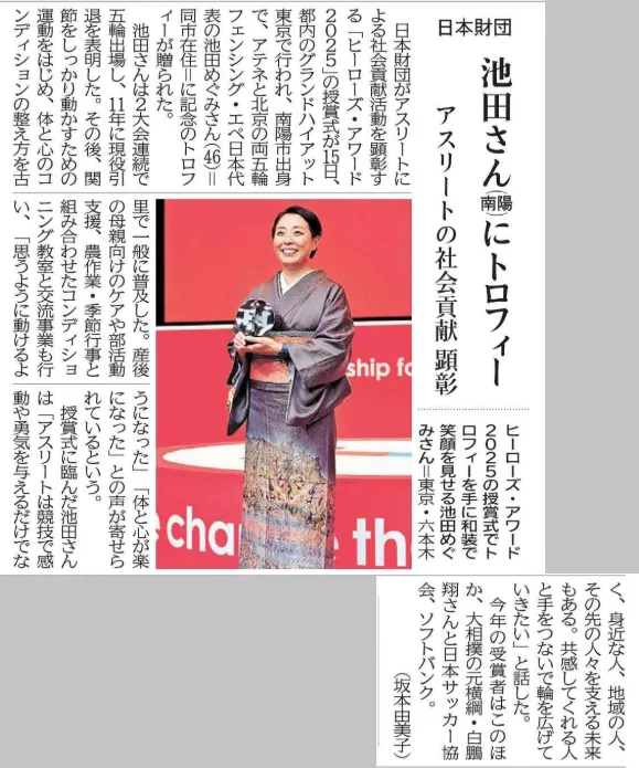 ヒーローズ・アワード2025の授賞式でトロフィーを手に和装で笑顔を見せる池田めぐみさん(H10卒)=東京・六本木 日本財団がアスリートによる社会貢献活動を顕彰する「ヒーローズ・アワード2025」の授賞式が15日、都内のグランドハイアット東京で行われ、南陽市出身で、アテネと北京の両五輪フェンシング・エペ日本代表の池田めぐみさん(46・H10卒)=同市在住=に記念のトロフィーが贈られた。