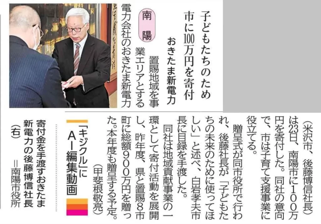 寄付金を手渡すおきたま新電力の後藤博信社長(S40卒)=南陽市役所 おきたま地域を事業エリアとする電力会社のおきたま新電力(米沢市、後藤博信社長・S40卒)は23日、南陽市に100万円を寄付した。同社の意向で、市は子育て支援事業に役立てる。