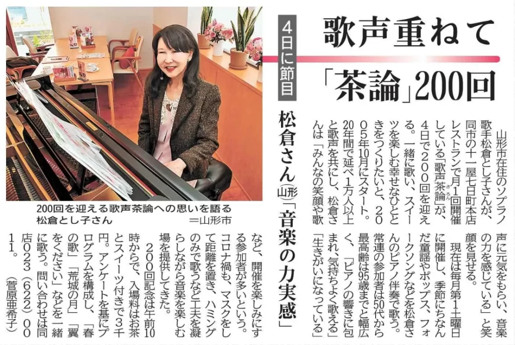 200回記念は午前10時からで、入場料はお茶とスイーツ付きで3千円。アンケートを基にプログラムを構成し、「春の歌」「荒城の月」「翼をください」などを一緒に歌う。問い合わせは同店023(622)0011。