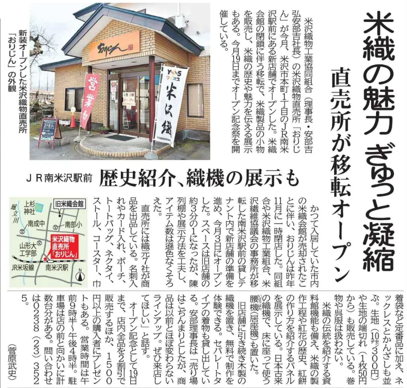 米沢織物工業協同組合(理事長・安部吉弘安部吉社長・S57卒)の米沢織物直売所「おりじん」が今月、米沢市本町1丁目のJR南米沢駅前にある新店舗でオープンした。米織会館の閉鎖に伴う移転で、米織製品の小物を販売し、米織の歴史や魅力を伝える展示もある。今月19日までオープン記念祭を開催している。