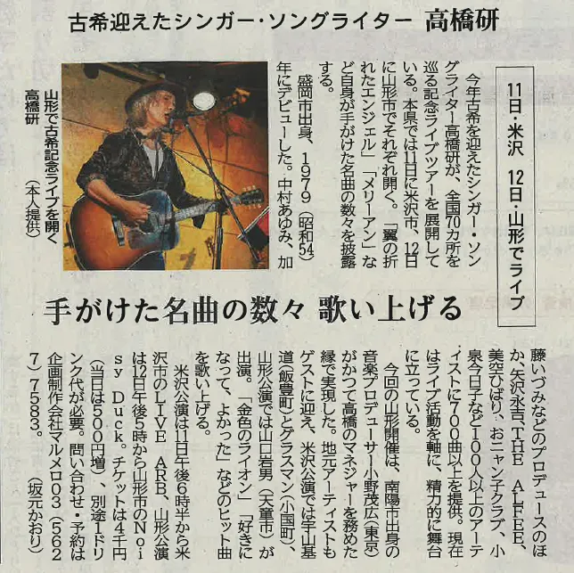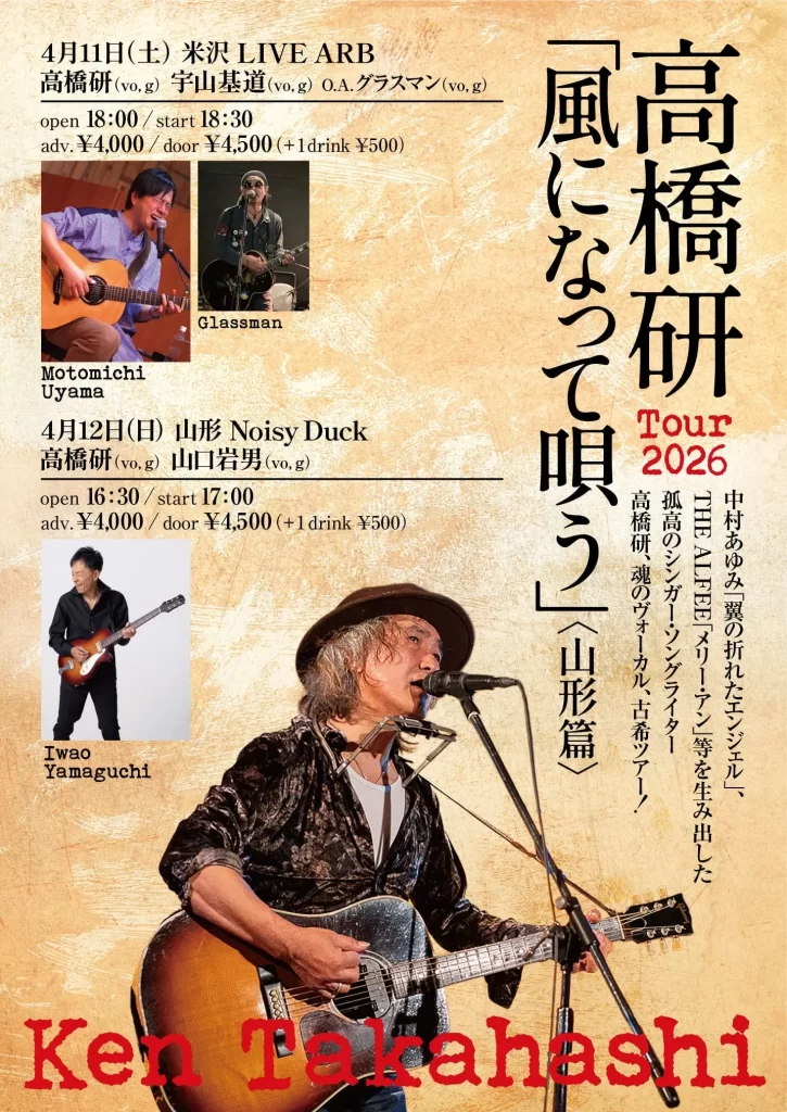 「数々のヒット曲を産み出した盛岡出身のシンガーソングライター高橋研が、古希にして初の山形ツアーを行います。ストリートに根差した彼独自の世界観は、心の奥底にある冒険心を揺り動かす唄となって皆さんに届くと思います。ぜひ体験していたければと思います。」小野茂広さん(S58卒)談